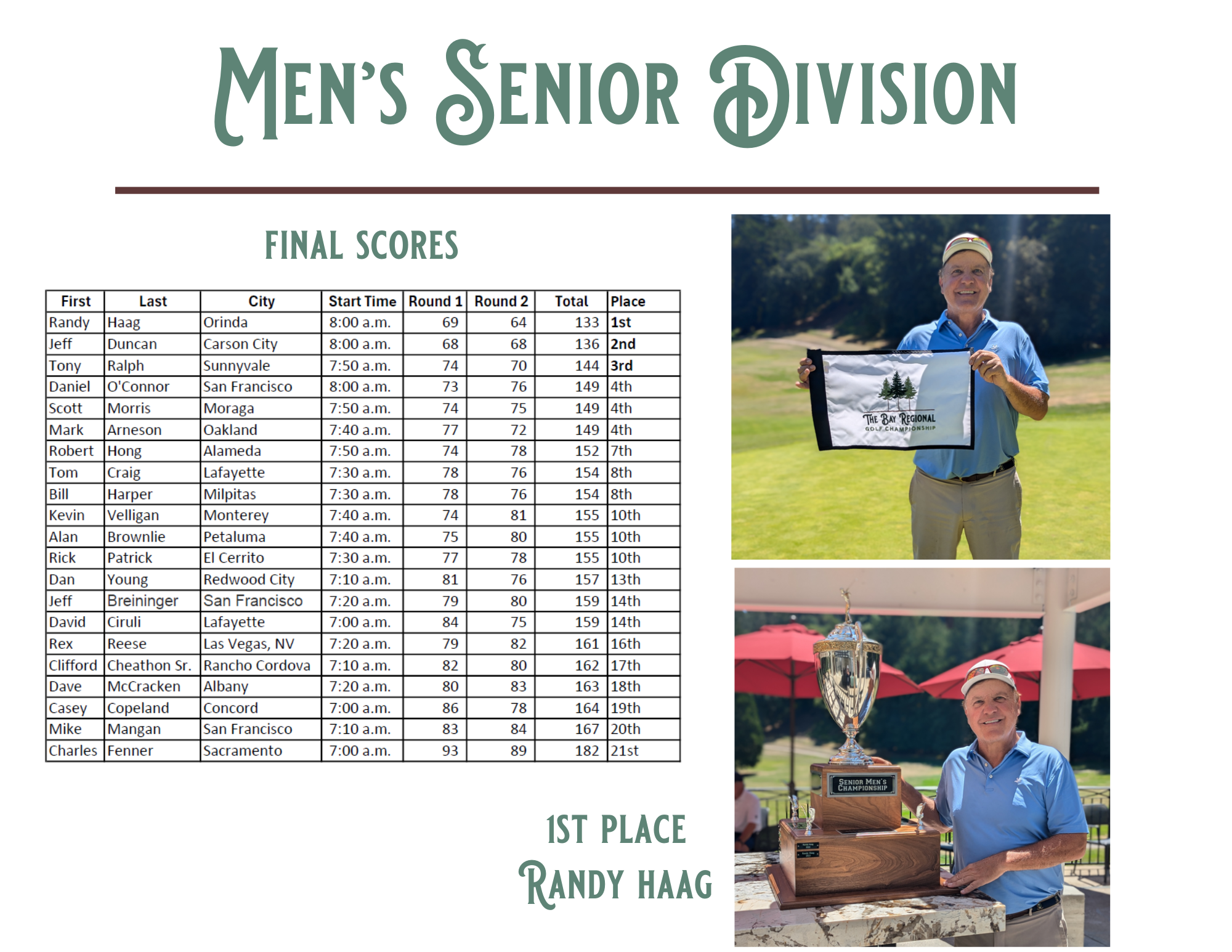 The 80th Bay Regional Golf Championship will be held Friday, August 1st through Sunday, August 3rd, 2025. The Championship will be 54 holes stroke play, with a 36 hole cut for the Men’s Championship only after Saturday’s round to the top 30 scores plus ties. The Men’s Senior Championship division will play 18 holes on Friday and Saturday (36 holes total) with no cut. Total entries are limited to 120 players and the following divisions will be conducted.