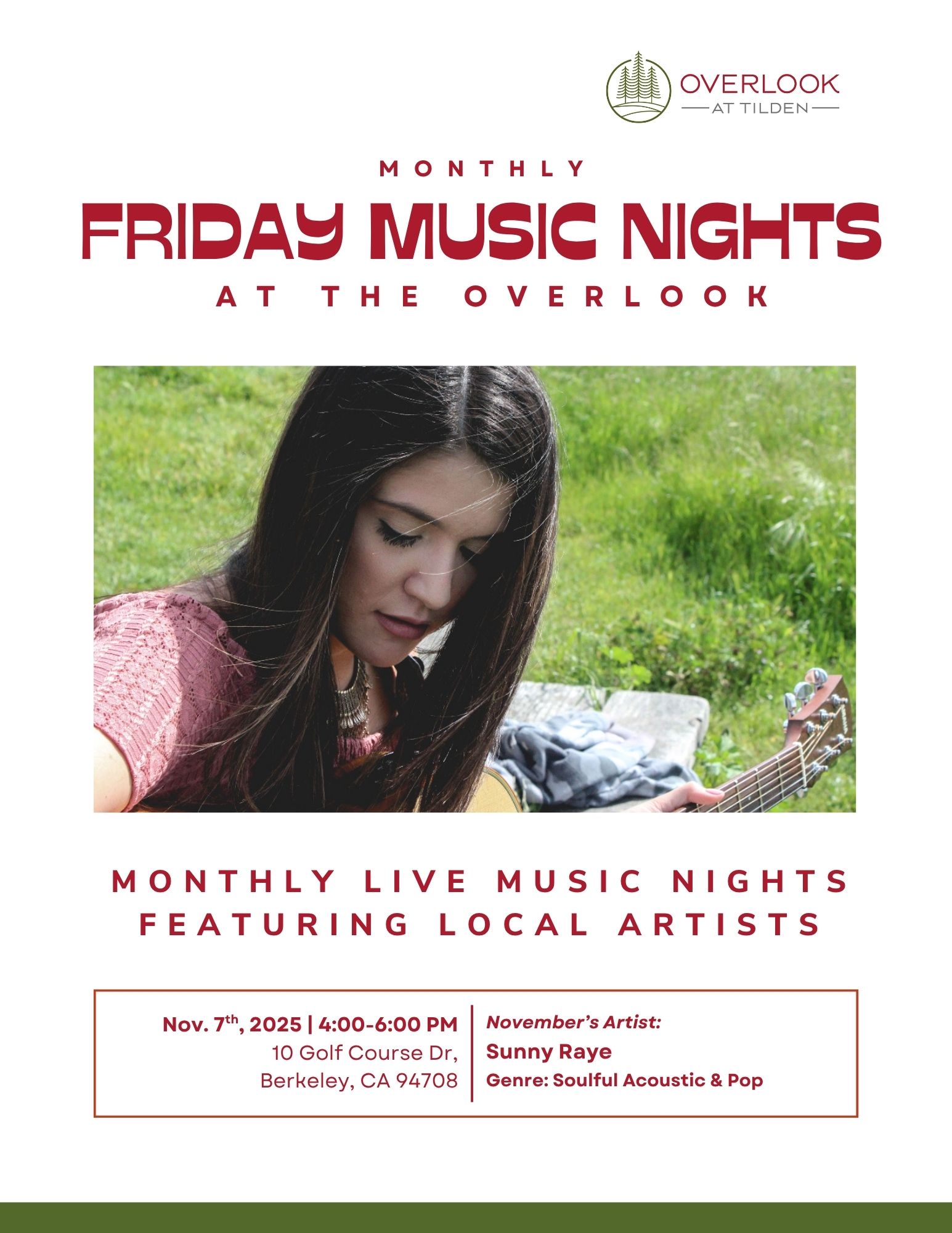 Kick off your weekend in style on Friday, November 7th from 4:00-6:00 PM with the sweet, soulful sounds of Sunny Raye! She’s bringing her solo acoustic magic to The Overlook, blending pop hits and indie classics. Whether you’re winding down after a long week or looking for the perfect setting to enjoy food and drinks […] ...