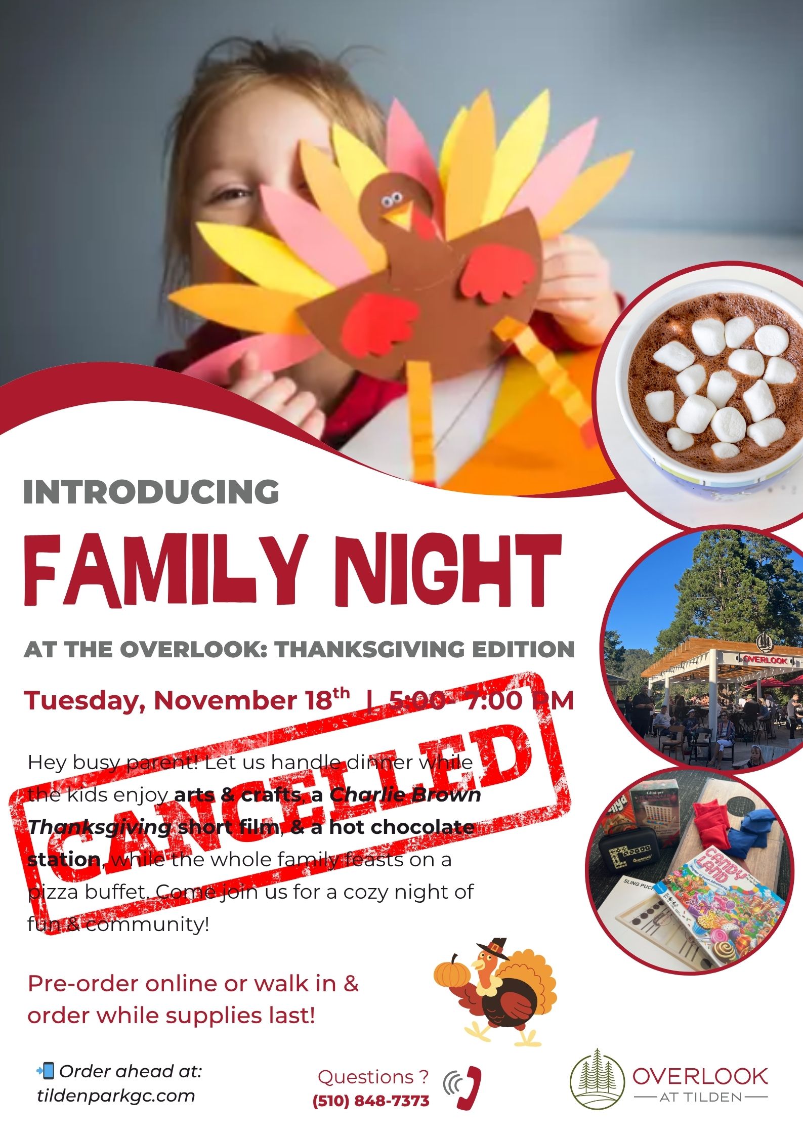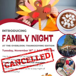 Celebrate November Family Night at The Overlook with crafts, a Charlie Brown Thanksgiving film, hot chocolate, and a pizza buffet for all ages! ...
